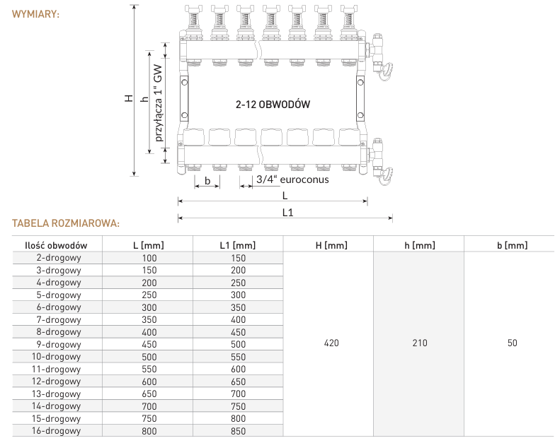 Maksymalna temperatura pracy rozdzielacza wynosi 70 °C, natomiast dopuszczalne ciśnienie sięga 6 bar. Co więcej, konstrukcja została przystosowana do pracy z glikolem o stężeniu do 50%, dlatego sprawdza się w instalacjach narażonych na ryzyko zamarzania. Rozstaw pomiędzy belkami to 210 mm, z kolei otwory euroconus ¾” rozłożono co 50 mm. W rezultacie montaż przebiega szybko i bezproblemowo.