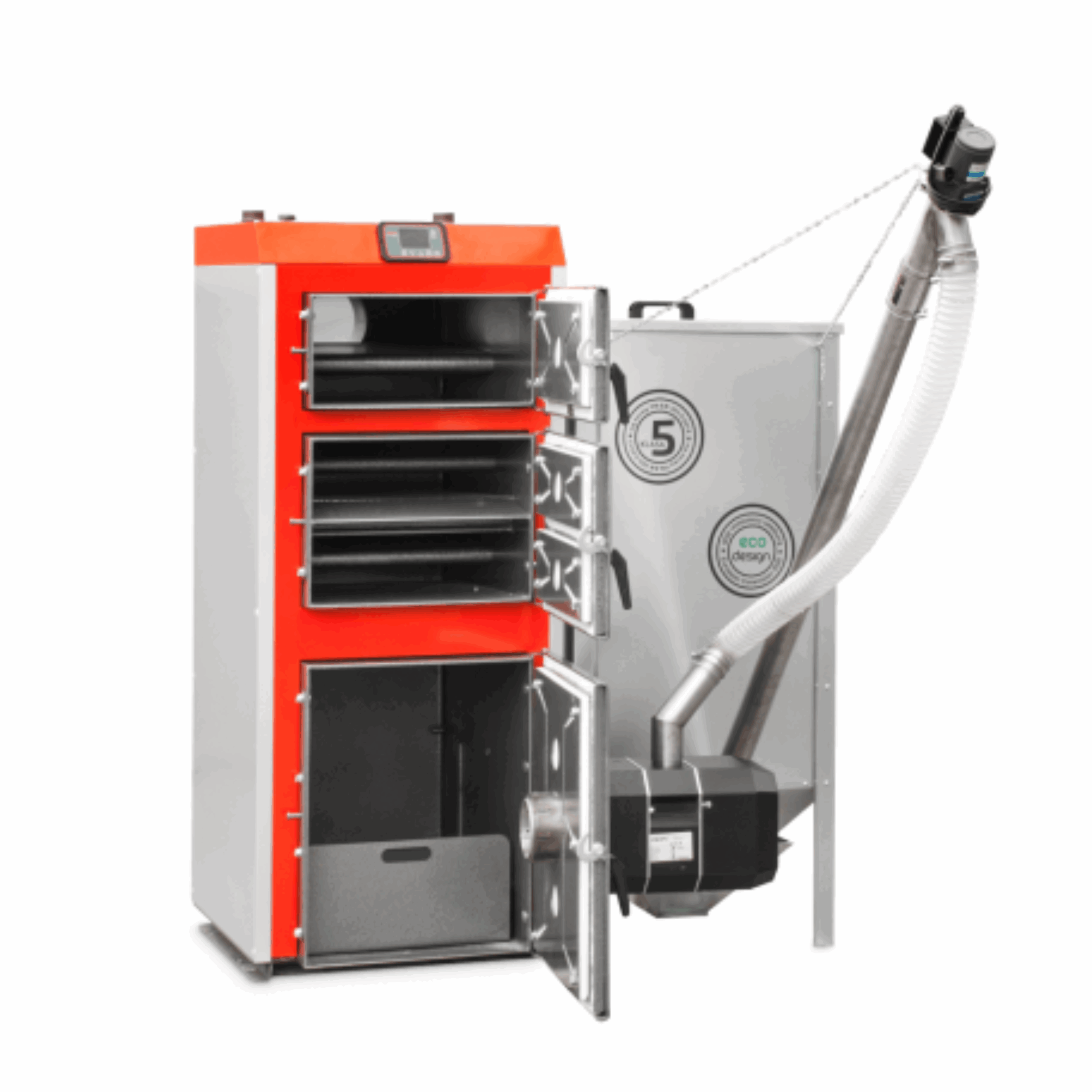 W dolnej części kotła znajduje się palnik z podajnikiem paliwa oraz napędem. Obok umieszczono zbiornik, do którego użytkownik wsypuje pellet. Podajnik automatycznie dostarcza paliwo do palnika, dlatego obsługa urządzenia jest tak wygodna. Pod palnikiem znajduje się popielnik, gdzie gromadzi się popiół powstający w procesie spalania. Wentylator nadmuchowy tłoczy powietrze do komory palnika i kieruje je przez specjalne otwory do strefy żaru. W efekcie spalanie przebiega sprawnie i bez strat energii. Sterownik reguluje zarówno ilość podawanego paliwa, jak i pracę wentylatora, dzięki czemu użytkownik otrzymuje optymalne warunki grzewcze.