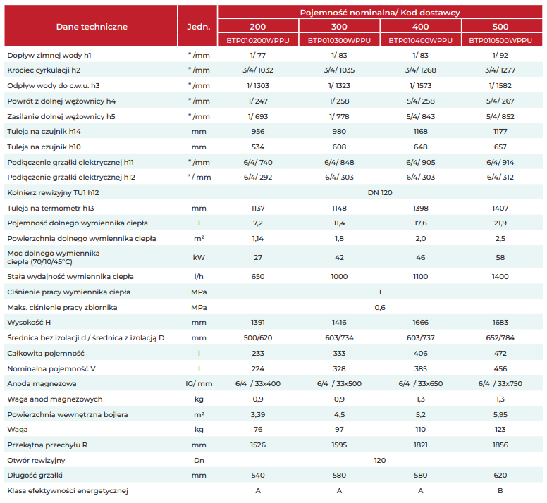 Seria zasobników obejmuje modele o zróżnicowanej pojemności. Zbiorniki do 500 litrów posiadają twardą izolację PU, która skutecznie ogranicza straty ciepła. Większe podgrzewacze, od 750 do 2000 litrów, wyposażono w zdejmowaną izolację. Dzięki temu można je łatwo transportować i montować nawet w trudniejszych warunkach.